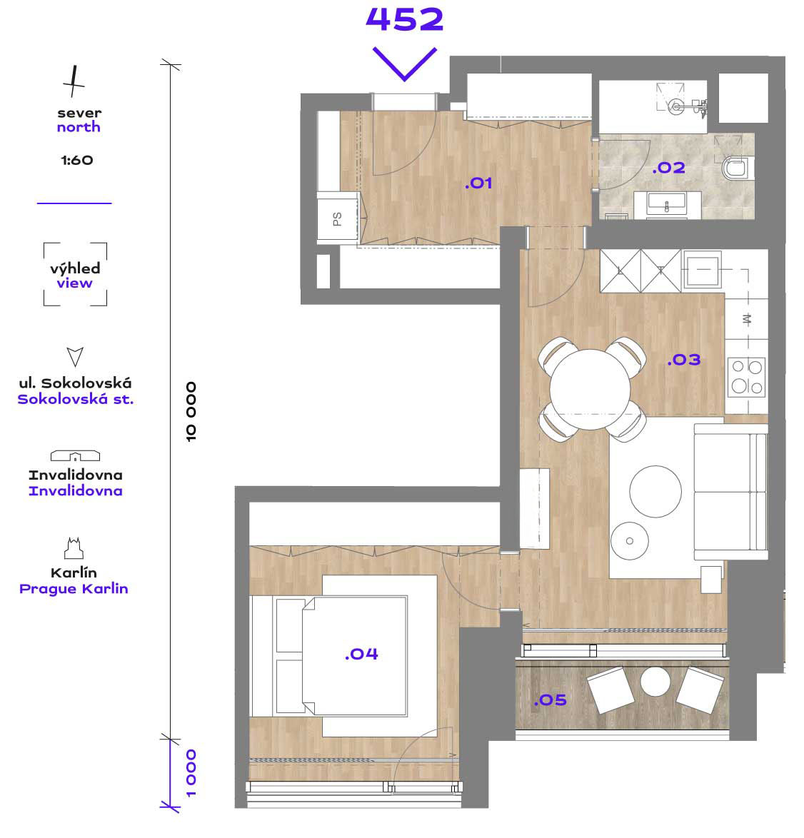 Ideální dispoziční řešení pro páry, které hledají nadčasové bydlení v životem pulzující čtvrti. Obývací pokoj je spojený s kuchyňskou linkou, vzniká tak otevřený prostor, který je díky velkoformátovému oknu navíc příjemně prosvětlený.