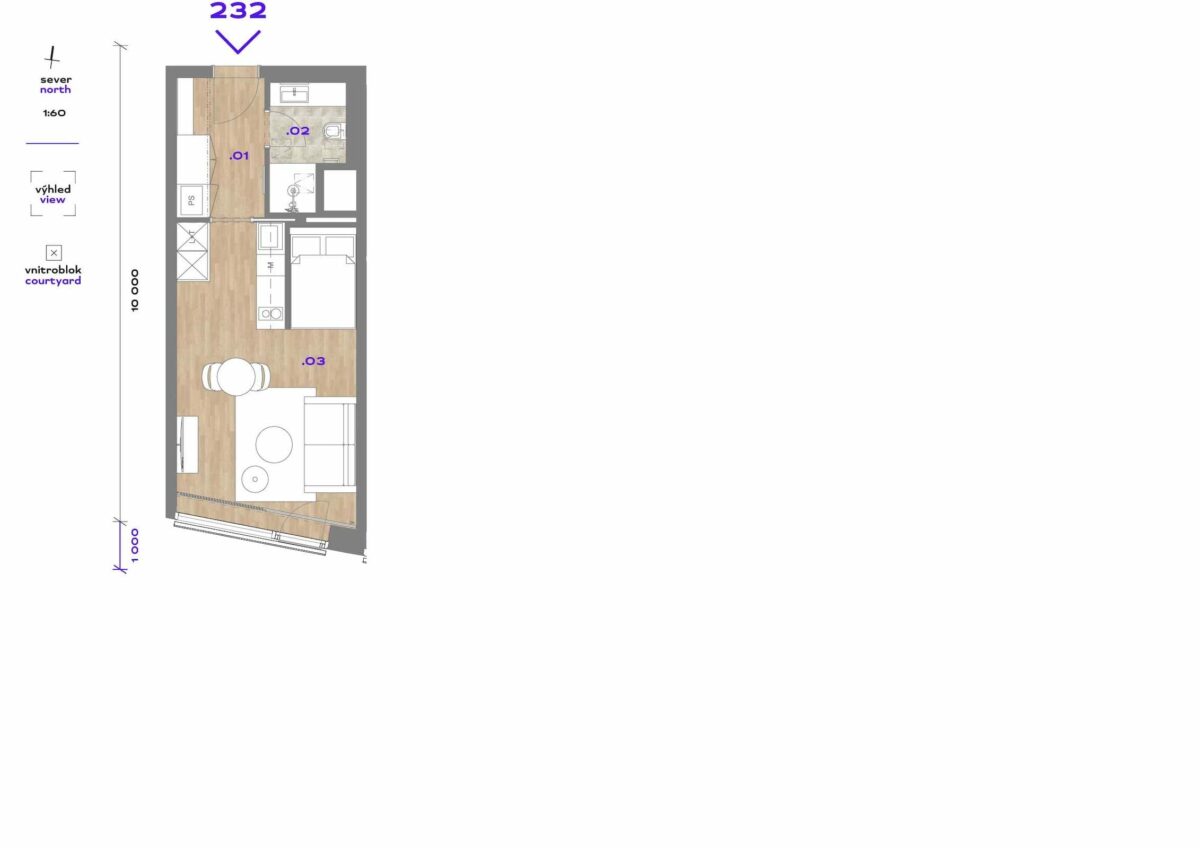 Compact studio apartments offer modern housing for individuals who value comfort above all else. The main section connected to the kitchen is generously apportioned and kept bright due to a large-format window. The private zone is cleverly hidden behind a partition wall, guaranteeing peace and privacy.